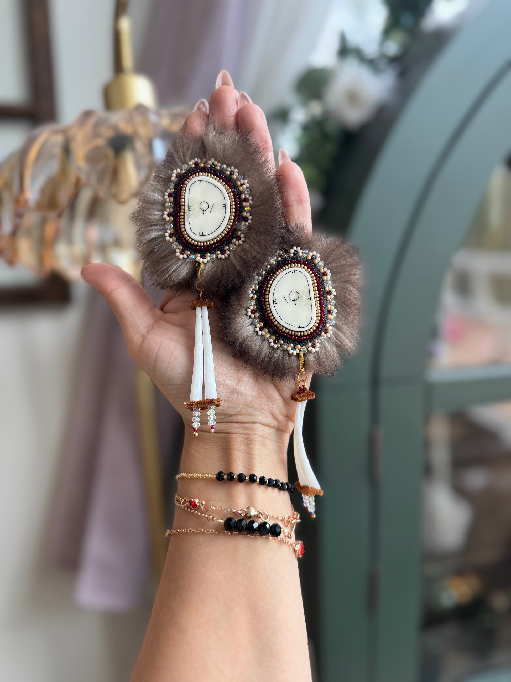 Ivory centers made by Shirley Hootch Jewelry, made with sea otter fur trim and backed with moose leather. Dentallium dangles that are detachable.
