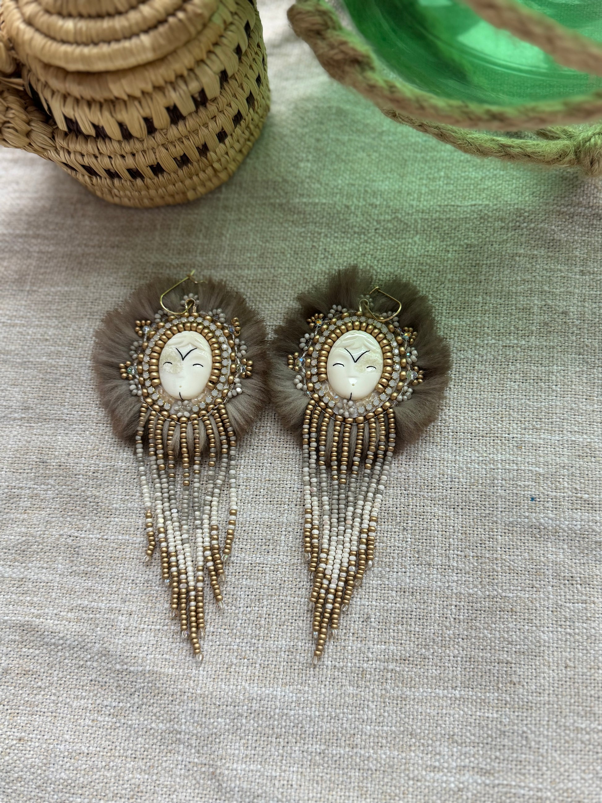 Gold and cream fringe earrings with Ivory faces by Shirley Hootch, beaver trim, backed with moose leather. Gold plated kidney hooks